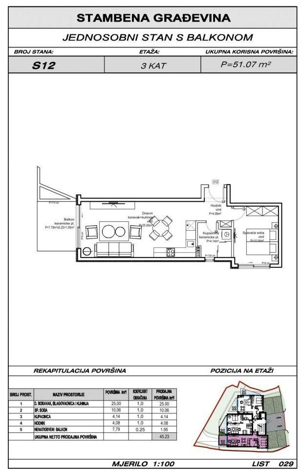 Apartmán S12 s výmerou 45,23 m² sa nachádza na 3. poschodí novostavby.