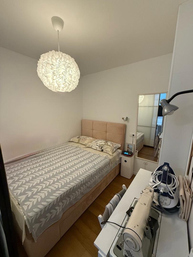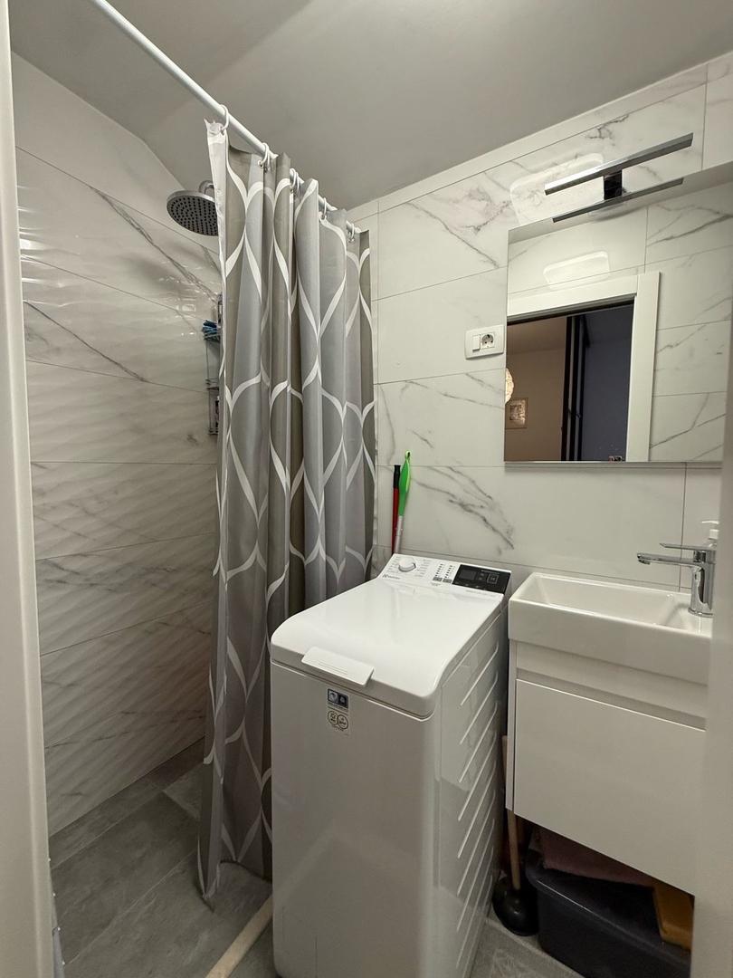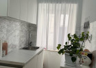 Štúdio: kuchynská časť, kúpeľňa, denná zóna oddelená od spálne posuvnou stenou.