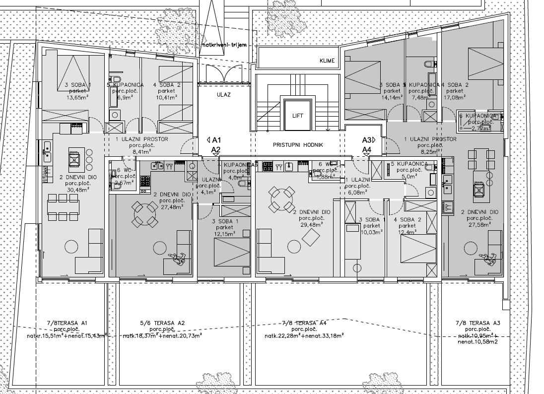 A1 – 81,96 m², 2 spálne, kúpeľňa, WC, terasa – 375 000 €