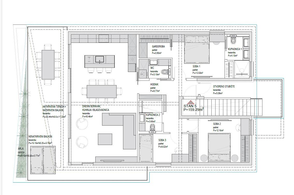 Pozostáva z priestrannej obývacej izby s otvorenou koncepciou kuchyne a jedálne so vstupom na krytú terasu a balkón. Tri komfortné spálne, dve moderné kúpeľne a ďalšie WC zaisťujú pohodlie a súkromie. Okrem vyššie uvedeného sa strešný apartmán môže pochváliť aj priestrannou strešnou terasou, ktorá ponúka nádherný, ničím nerušený výhľad na more – ideálne miesto na oddych a vychutnávanie si západov slnka.