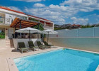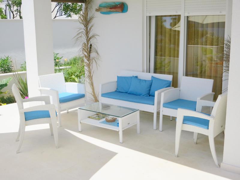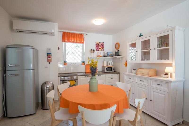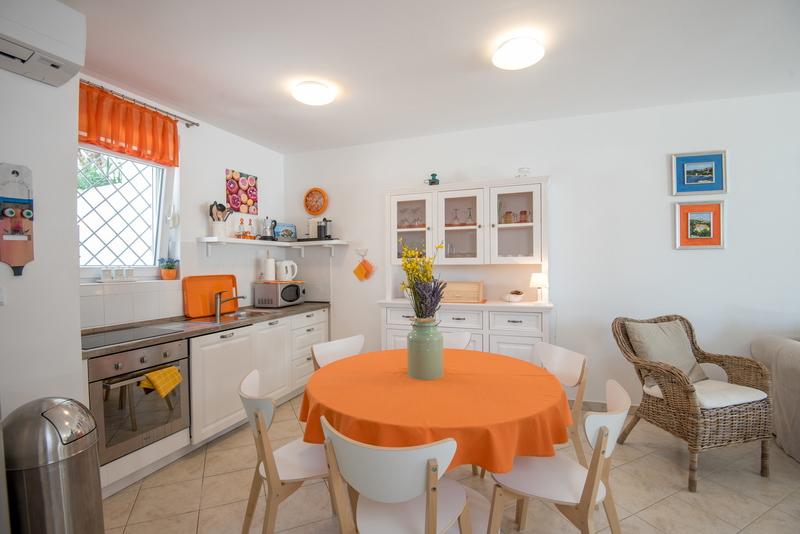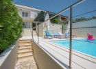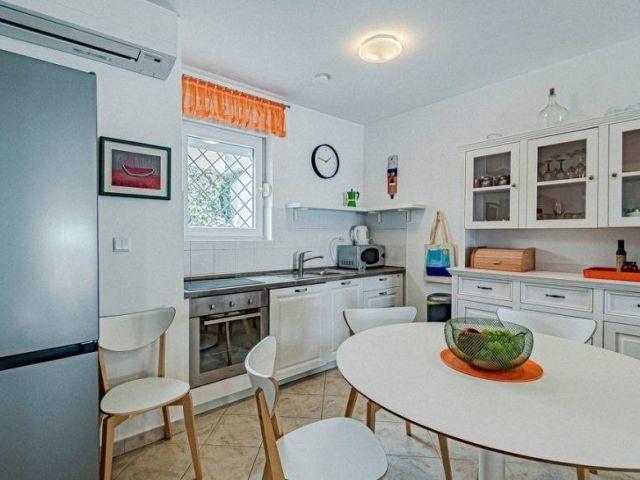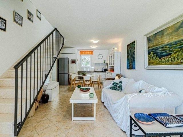 Dom s rozlohou 120 m² je rozdelený na dve podlažia. Prízemie ponúka hosťovskú izbu, elegantnú kúpeľňu, priestrannú kuchyňu s jedálňou a svetlú obývaciu izbu s výstupom na krytú terasu. Terasa je obklopená stredomorskou záhradou s vyhrievaným bazénom – dokonalé miesto na relax a spoločné chvíle.