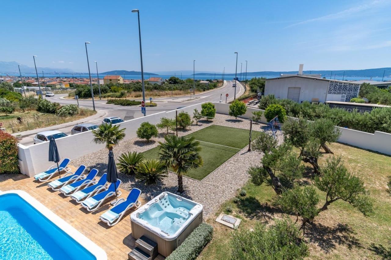 Priestranná terasa ponúka nádherný výhľad na more, záliv Kaštela a mesto Split, čím vytvára dokonalé prostredie pre relaxáciu.