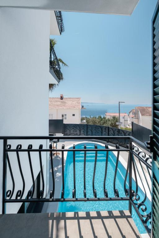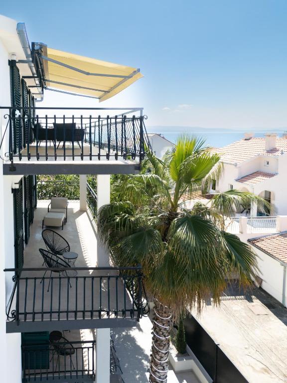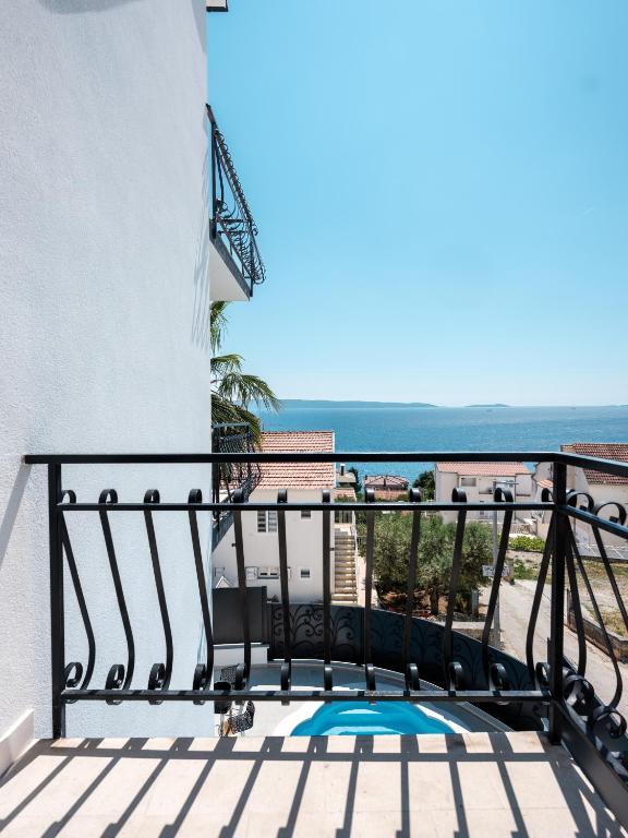 Prvé poschodie: 2 spálne, 3 kúpeľne, kuchyňa s jedálňou, priestranná obývacia izba, veľká terasa s výhľadom na more.