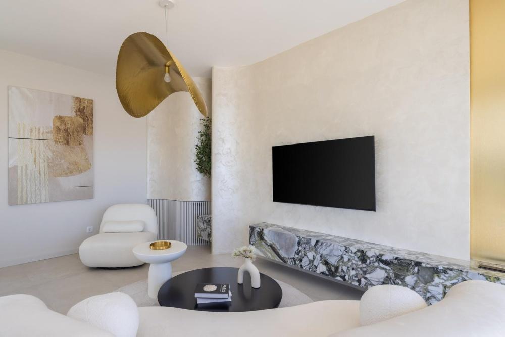 Na prízemí sa nachádza WC, práčovňa a otvorená koncepcia obývačky, kuchyne a jedálne s výstupom na terasu s bazénom, vírivkou a grilom, s podlahami a bazénom pokrytým prvotriednou talianskou keramikou. vo veľkom formáte.